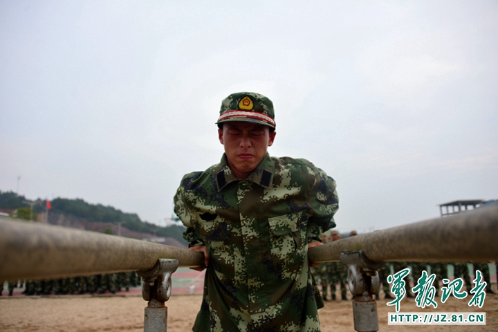 双杠杠端臂屈伸。一名新战士正在挑战自己的极限。