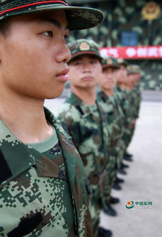 武警福建总队直属支队新训大队组织新兵进行看齐训练。