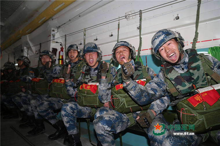 飞机上升到规定高度后机门打开,新兵们为自己加油打气