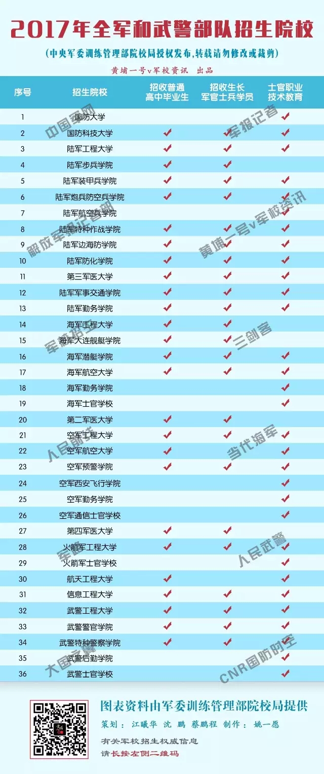 根据军队招生工作计划,经军委机关招生主管部门授权,“黄埔一号v军校资讯”联合多家网络平台发布“2017年军队院校招生单位名录”。目录中的这些院校,都是军改后院校的新名称,且为首次成体系曝光。需要说明的是,这36所院校只是今年招生的院校,并非军改后的所有院校。
