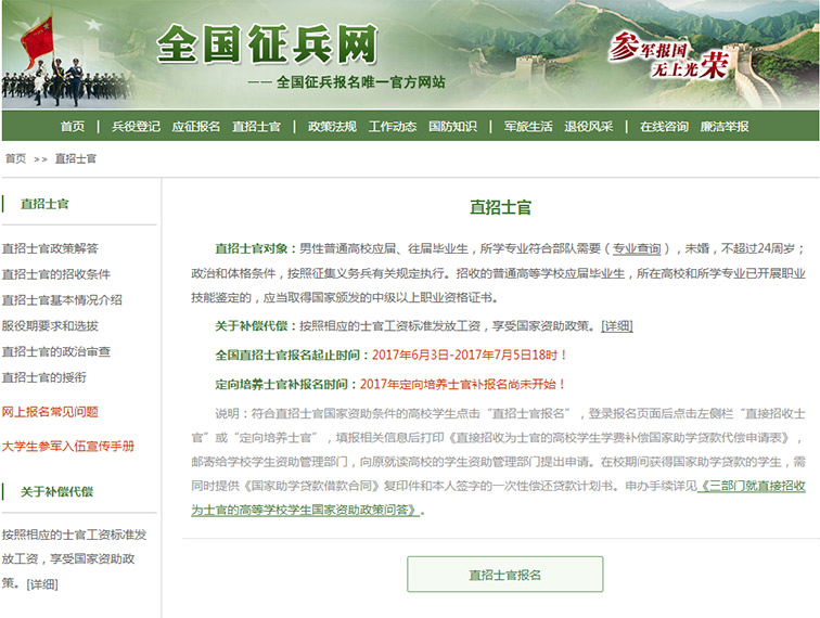 中国军网北京6月2日电 据全国征兵网消息,全国直招士官报名从2017年6月3日正式开始,2017年7月5日18时截止。