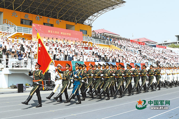 中国人民解放军三军仪仗队在高校进行分列式表演。陈平 摄