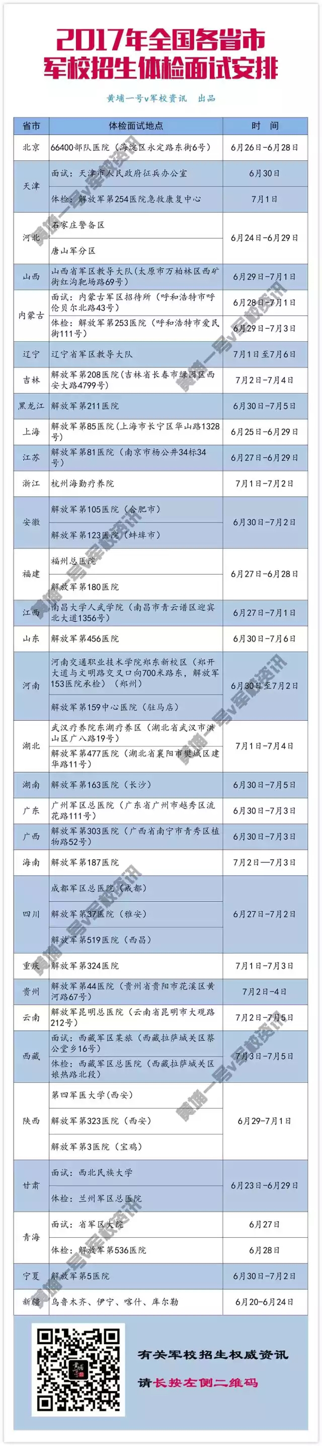 根据军队招生工作计划,本月各省市将展开体检面试。高考结束后的这段时间,广大考生及家长纷纷给本平台留言,希望尽早了解体检面试的安排,以便做好相关准备。为此,军报记者联合黄埔一号编辑部逐一查阅各省市招生信息发布平台,电话连线了各地招生部门和有关人员,收集汇总了相关信息,列出了2017年各省市军校招生体检面试计划。