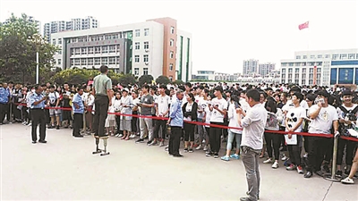 在项城市第一高中考点,下午5时,人武部副部长郑照辉和几位工作人员已准备好了征兵宣传单。5时16分,考生聚齐后,警戒线打开,考生们如潮水般地涌出来,不到5分钟,1800余份宣传单就被一抢而空。5时20分,还有不少考生和家长围着工作人员咨询征兵政策。