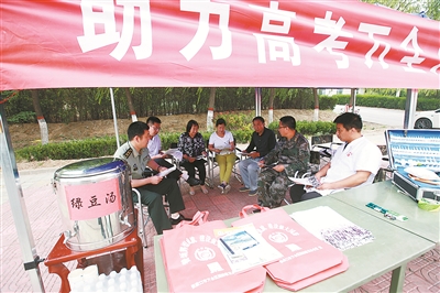 离学校门口最近的两个遮阳篷,此时却显得有些冷清——没有张罗着发传单的人员,篷下整齐地摆放着几排椅子,四周桌子上放着国防报刊、征兵宣传手册以及免费的矿泉水、绿豆汤,还有两位身着白大褂的医务人员静静坐在一旁。蓝色篷顶上,“助力高考万全人武部在行动”的红底条幅在风中微微飘扬。这里是区人武部搭设的爱心服务站。没有人招呼,很多家长却不约而同选择了到这里歇脚。