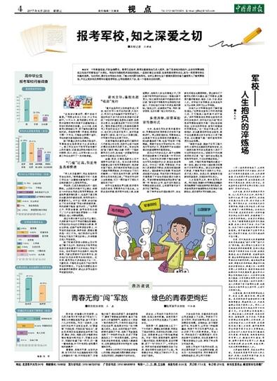 今年,是深化军队改革的重要年份,军事院校的改革转隶正在有条不紊地进行。停止招收国防生、军事院校从应届高中毕业生里招收的数量减少。招生数量虽然下降,但是“军校热”不能降温。提高中学生对军校的认知,不仅是对军校的认可,更是培养中学生国防意识和爱国精神的重要途径。