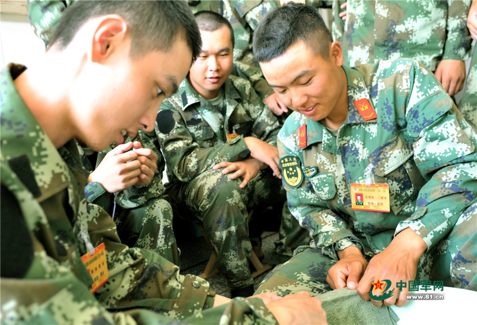新兵三大队一中队,二班班长石佳乐正在教新战士整理内务。