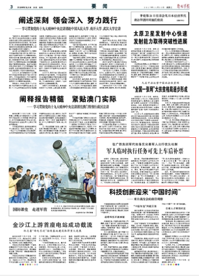 为了让军人出行优先工作落到实处,驻广铁集团军代处积极协调广铁集团完善相关机制,明确因临时执行公务、急需乘车的军人,可先进站上车后补票。请关注《解放军报》的详细报道——