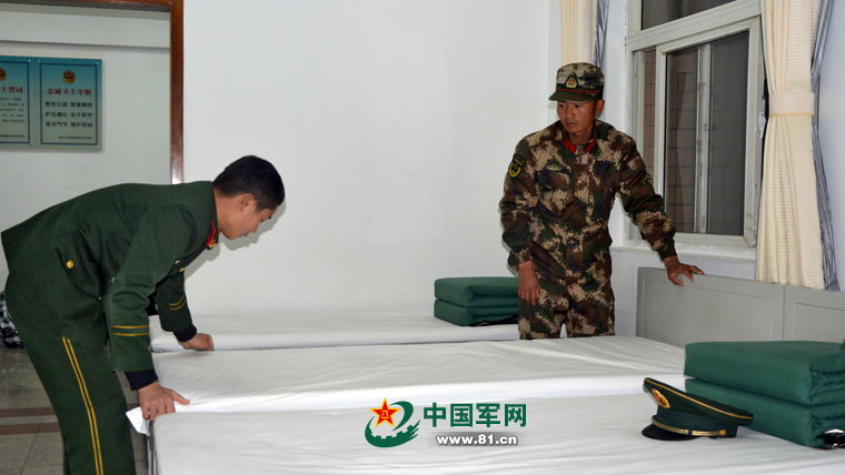 班长为新战士整理床铺