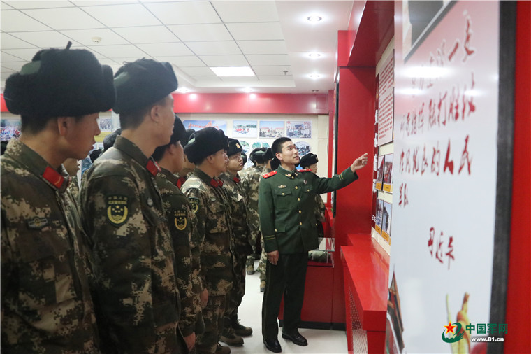 一名曾经立功的班长在功臣名录版块前讲述自己的军旅故事。