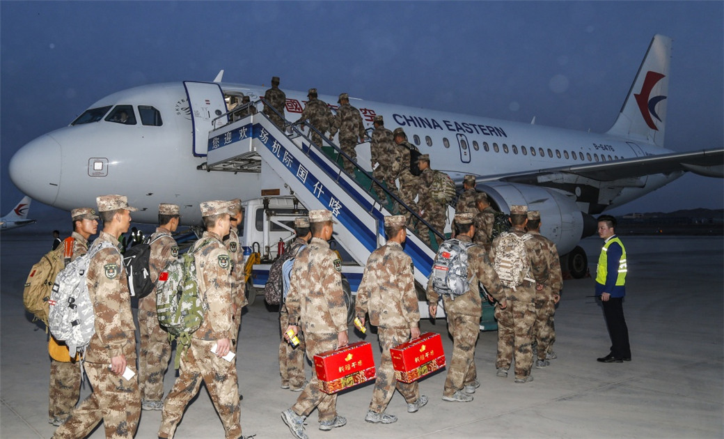 4月5日,新战士们登上喀什直飞阿里的民航包机。新华社 刘晓东 摄