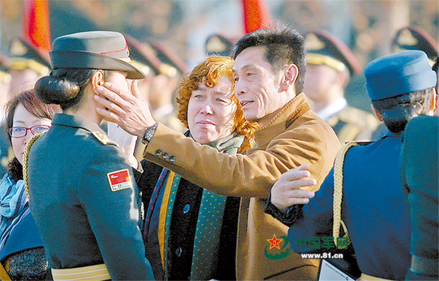 接受过“家长同志”的检阅后,一名女仪仗队员激动地跑向父母,父母眼含热泪,爱怜地拭去女儿眼角的泪水。