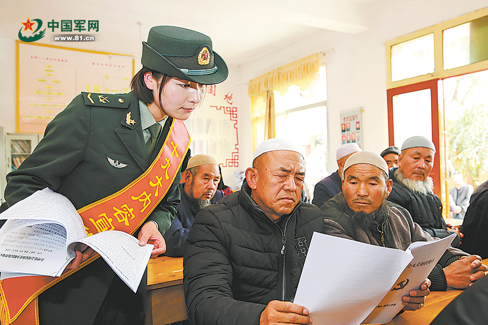 连日来,陆军第76集团军某防空旅组织理论骨干深入驻地少数民族乡镇,为群众及时宣传党的十九大报告里振奋人心的惠民政策。钟泽畅摄
