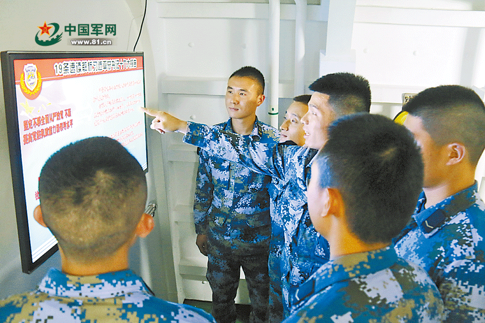 10月23日,东海舰队某驱逐舰支队西安舰组织官兵认真学习党的十九大报告。