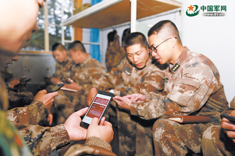 10月29日,第76集团军某旅官兵利用政工网和手机客户端等载体学习十九大精神。袁宏彦 摄
