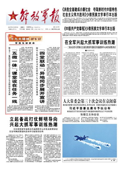 解放军报讯 蒋玉鹏、马胜伟报道:5个校区同时展开授课,万余官兵同步聆听辅导。10月27日,陆军工程大学12名政治理论专家组成多个十九大精神宣讲小组,分赴驻南京、石家庄、重庆、武汉、徐州等地的所属单位,分专题同步宣讲十九大精神。这是该校结合异地办学实际,确保学习宣传贯彻十九大精神一人不漏的有力举措。