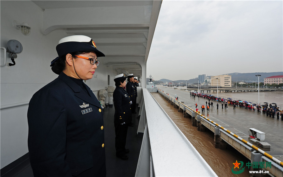 12月28日,圆满完成“和谐使命-2017”任务的中国海军和平方舟医院船缓缓驶抵浙江舟山某军港码头时 ,医护人员在甲板站坡。江山摄