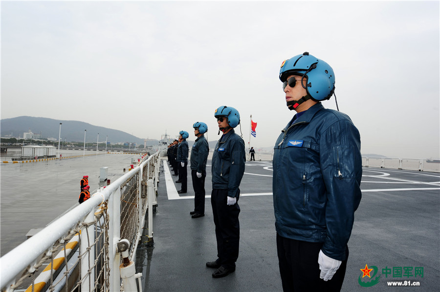 12月28日,圆满完成“和谐使命-2017”任务的中国海军和平方舟医院船缓缓驶抵浙江舟山某军港码头时,飞行员在甲板站坡。江山摄