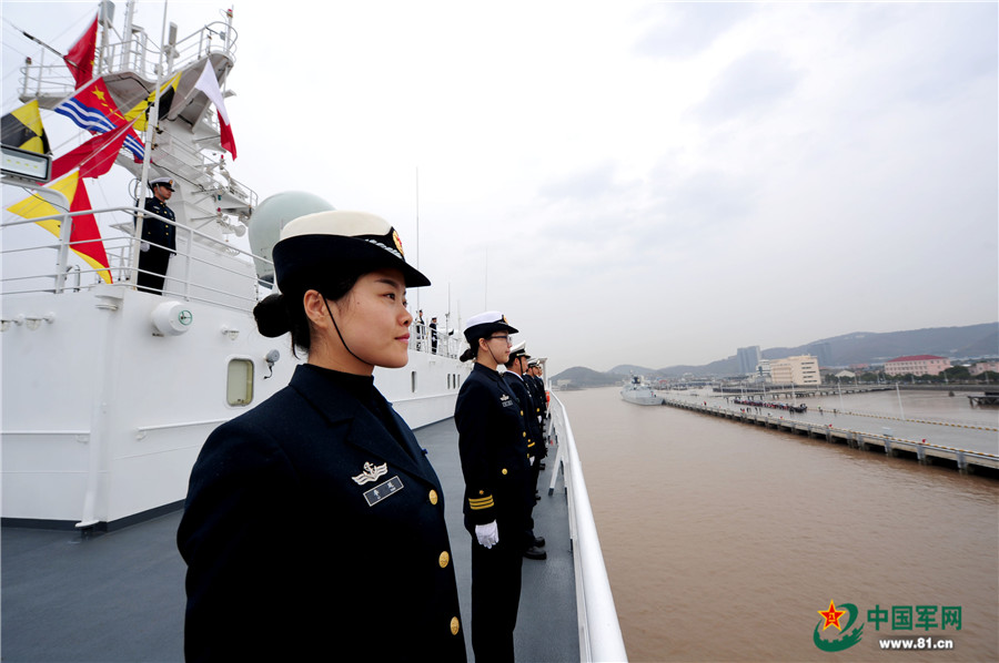12月28日,圆满完成“和谐使命-2017”任务的中国海军和平方舟医院船缓缓驶抵浙江舟山某军港码头时,海军官兵在甲板站坡。江山摄