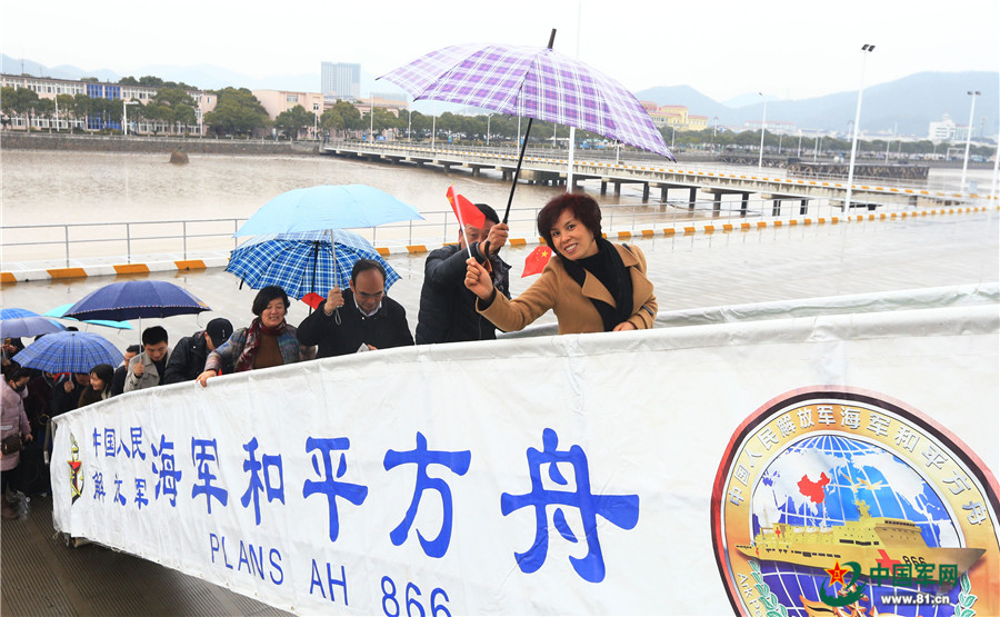 12月28日,圆满完成“和谐使命-2017”任务的中国海军和平方舟医院船驶抵浙江舟山某军港码头后,海军官兵家人登船迎接。韩林摄