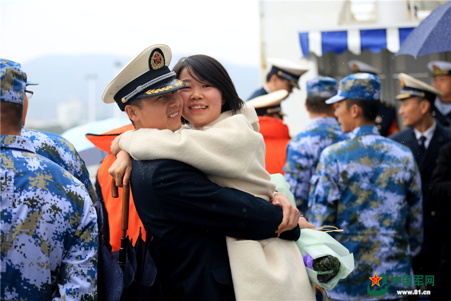 12月28日,圆满完成“和谐使命-2017”任务的中国海军和平方舟医院船驶抵浙江舟山某军港码头后,一名海军军官与家属相拥。韩林摄