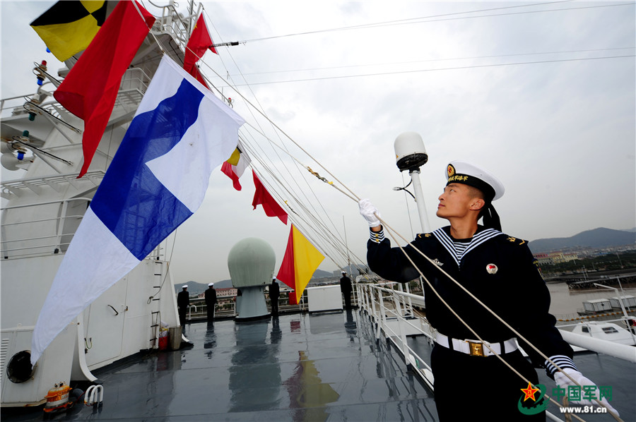 12月28日,圆满完成“和谐使命-2017”任务的中国海军和平方舟医院船缓缓驶抵浙江舟山某军港码头时,信号兵升起信号旗。江山摄