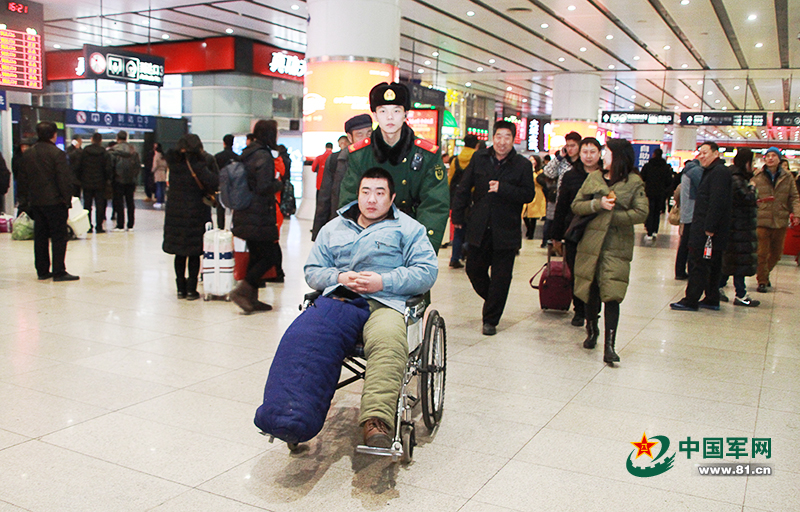 武警执勤哨兵为一位行动不便的群众提供服务帮助。 姜瀚摄