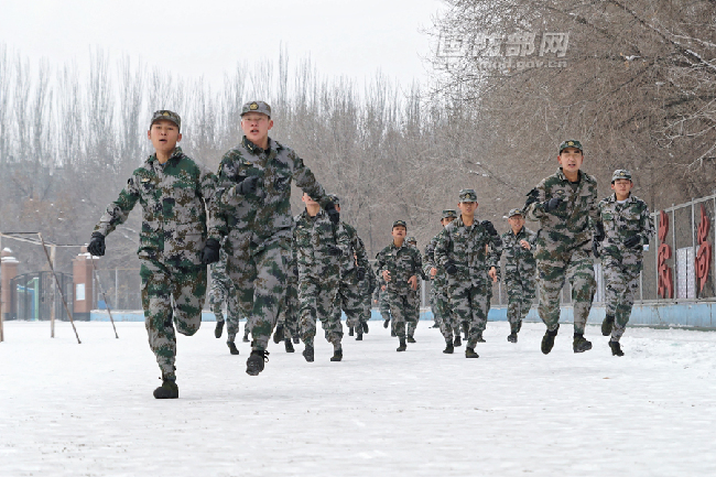 近日,石河子大学国防生在驻校选培办要求下进行冬季室外训练。5000米长跑、100米冲刺,为锤炼过硬身体素质,国防生在训练期间不怕苦不畏寒,充分展示了当代准军官的风采。据悉,多年来石河子大学国防生一直坚持冬训,“冰天雪地国防绿”已成为冬季校园中一道独特的风景线。