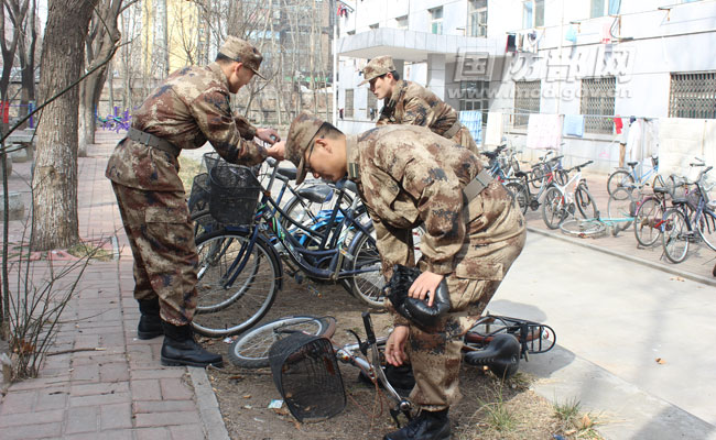 国防生开展整理山大中心校区废旧自行车活动。