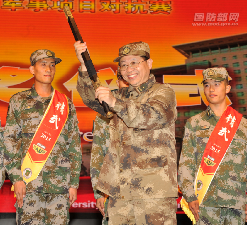 解放军理工大学校长王金龙为冠军颁奖。李爱明摄