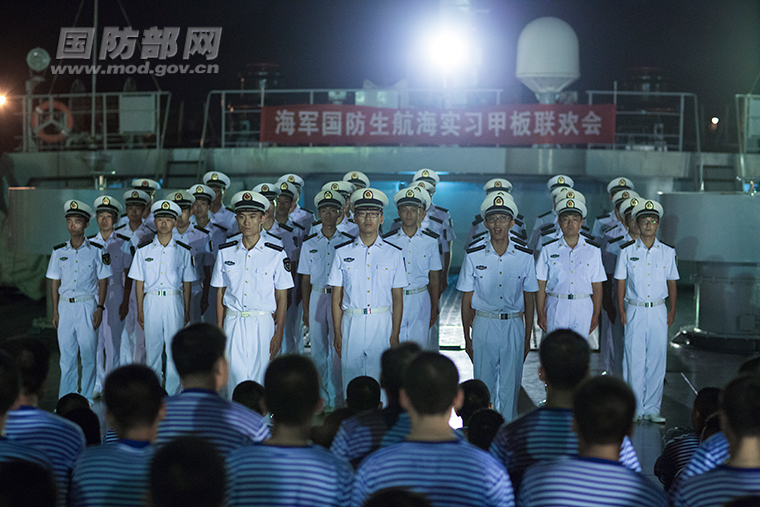 航海实习甲板联欢会上的海大国防生。
