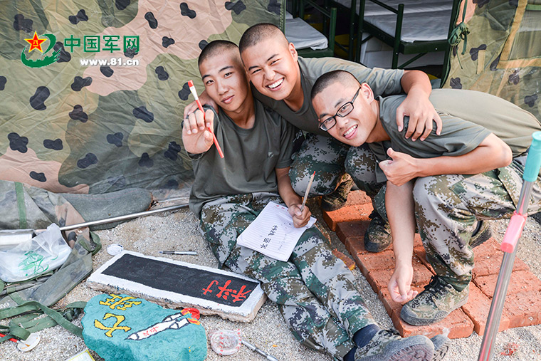 搭好帐篷,总觉得少点什么?没错!战地文化。必须得把咱们住的地方搞得漂亮,“来,我们先用砖头把路铺好,拿一个大的石头做标语,画笔呢,我要画个火箭——”