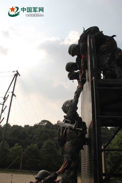 四米高墙模拟行军中通过较高拦阻的场景,最考验团队协作能力。要求队员分工明确,各司其职,只有紧密配合才能创造出最短的通过时间。