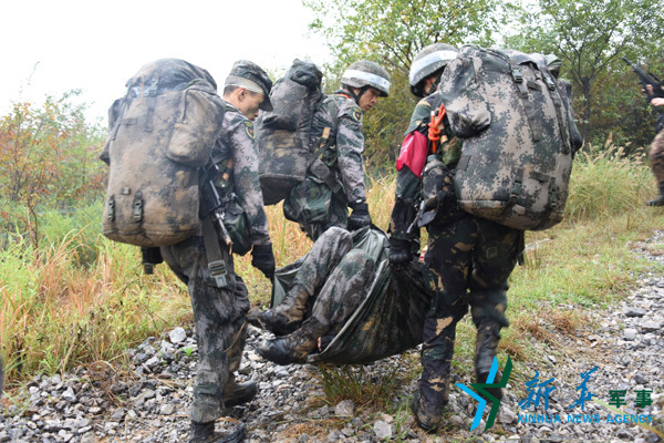 利用简易器材转运“重伤员”。新华社记者黎云 摄