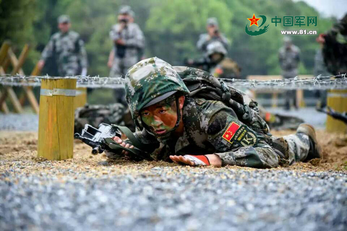 巾帼不让须眉,图为特战女队员通过组合障碍低装网。