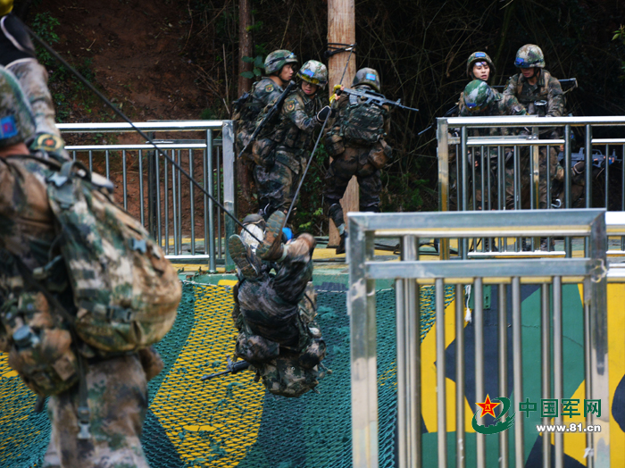 你来精准架绳,我去快速机动,图为特战班通过绳桥。