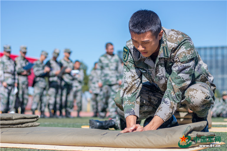 在打背包环节中,选手们八仙过海、各显神通。从容不迫、耐心细致的精神面貌感染了在场的观众,既是对内务作风的检验、更是对军事养成的考验。“宁可千日无战,不可一日不备”的精神在昆工国防生的军事训练中展现得淋漓尽致!