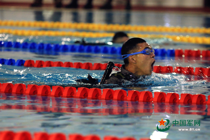 着装游泳:模拟特战班以武装泅渡接力方式将情报送至对岸的任务。