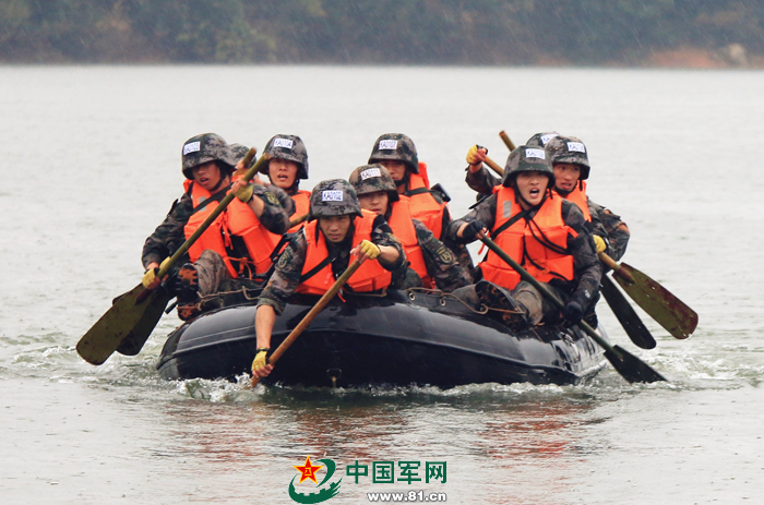 船只机动:模拟特战班在航渡后换乘班用橡皮舟,利用桨等简易器材将全班运送到滩头指定安全位置隐蔽接敌。