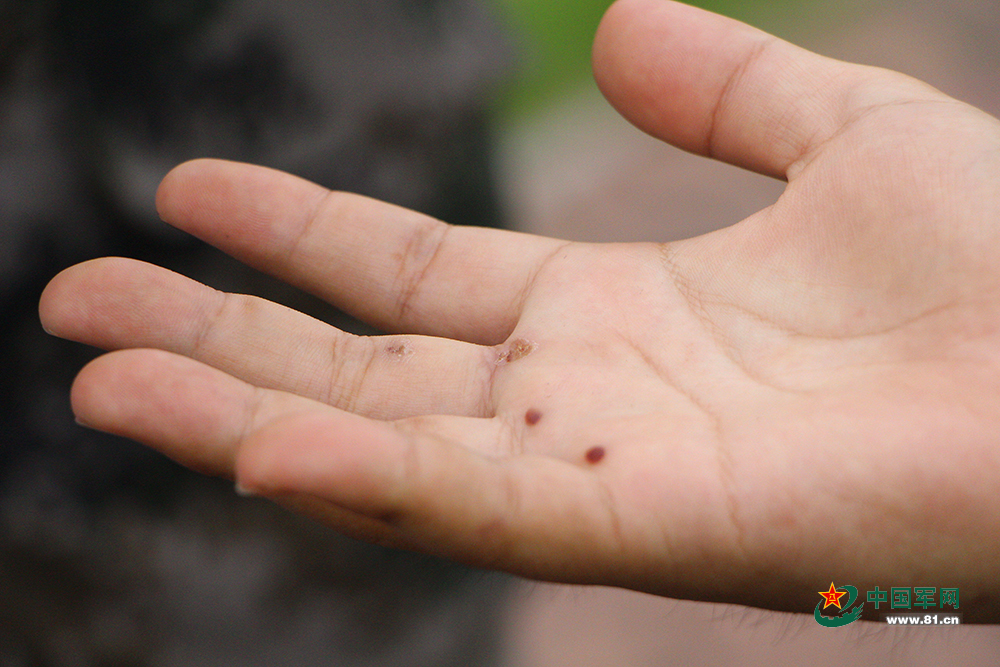 同样,在第一次全天候拉练中,4连旗手张焱博双手长起了痱子,痛得他直想用力去抓,班长得知情况后协调换一个人担任旗手,但张焱博却执意不肯,说道“既然我是旗手,就要坚持到最后。”在结束当天的拉练后,班长看到他通红的双手,已经化了脓。