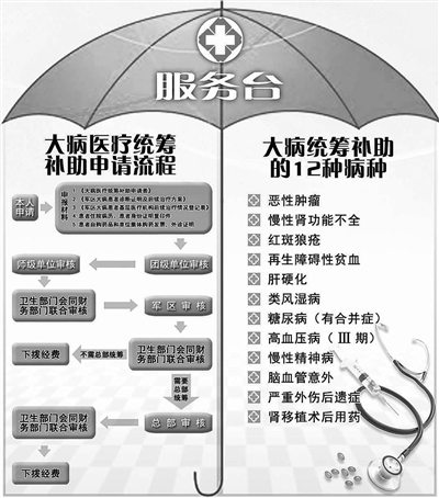 2004年,《军队医疗保障制度改革方案》在全军正式施行,我军大病统筹制度确立,对癌症、肾移植术后用药等12种消耗较大的病种实行大病医疗统筹,旨在有效减轻罹患大病官兵家庭和部队的经济负担。