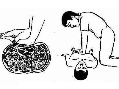 (2)定位按压点 简单定位可粗略地将一手的手掌根部放在胸骨中下1/3交界处,另一手叠于其上。准确定位应按下列方法进行:抢救者站在患者的右侧,右手中指及食指从肋弓下缘手指沿肋弓上行到达肋骨与胸骨剑突之间的切迹处;中指置于切迹上,食指在其旁;将左手的手掌根部放在右手的食指旁,掌根长轴置于胸骨长轴上,这样可以保持按压的主要力量在胸骨上,并减少肋骨骨折的机会;右手离开切迹处,放在左手上;手指可以伸直或相互交错,但必须离开胸部进行按压。