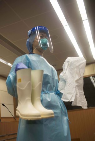 当日,香港医管局向媒体展示医护人员处理埃博拉个案的防护装备,一旦有怀疑个案,救护车及急症室医护人员都要穿着全套防护衣物。