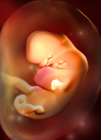 第6 -心脏跳动胚胎成长迅速,心脏开始划分心室,并进行有规律的跳动及开始供血。胎儿的细胞仍在迅速分裂。肾和心脏的雏形已经发育,神经管开始连接大脑和脊髓开始发育。 (长得好恐怖!!!)