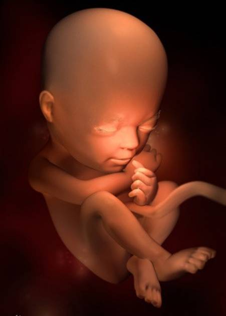第23-胎儿身长约20厘米,体重约450克。因皮下脂肪尚未产生,皮肤色红且折皱较多,皮肤的折皱是给皮下脂肪的生长留有余地。胎儿的嘴唇、眉毛和眼睫毛已清晰可见,视网膜已形成,具备了微弱的视觉。胎儿的胰腺及激素的分泌稳定发育。