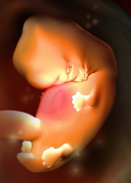 第7-胚胎长约12毫米,大头与身体不成比例。面部器官已可分辨,眼睛未长成但非常明显,鼻孔大开,耳朵略凹陷。手、脚及四肢幼芽初成,肌肉纤维和垂体已经发育。此时还听不到胎心音,但胚胎的心脏已经划分成左心房和右心室,每分钟大约跳150下。