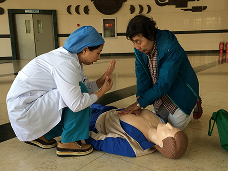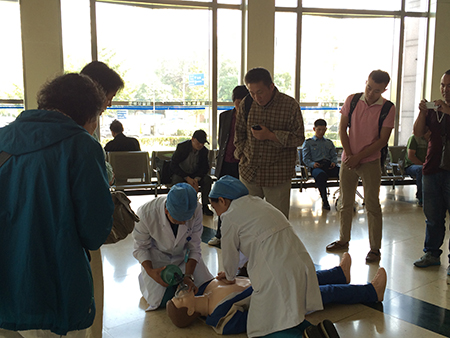 医院重症医学科工作很繁忙,无法集中抽调人员参加固定义诊,于是,医务人员采用“快闪”的方法,带着模拟人,在医院住院部大厅开展心肺复苏等抢救操作演示。上午9:00时,重症医学科刘涛等3位医生带着模拟假人出现在医院住院部大厅时,立即吸引了大家的目光。医生们就地展开抢救演示,还手把手地教群众操作要领,时间不长,但给大家留下深刻印象。