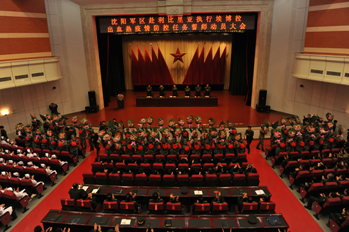 抗击埃博拉的号角已经吹响。11月6日,军区召开誓师动员大会,王教成司令员、褚益民政治委员亲自为医疗队员壮行。首长重托,官兵信任,亲人企盼,化作巾帼铿锵誓言,义无反顾汇聚军旗下,白衣天使的羽翼将再次绽放非洲大地!