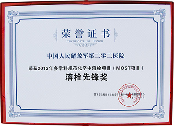 解放军第202医院神经内科对急性脑血管病的早期诊断与治疗是一大特色,有一整套按国际标准制定的卒中早期诊治规范,并率先在省内开通了“脑血管病绿色通道”,保证了急性脑血管病患者来院后不被延误,在黄金1小时内得到及时准确的救治。在超早期静脉溶栓有效性及安全性方面已达到国内领先水平,年溶栓数逾百余例,荣获了国家卫计委医疗质控中心颁发的“溶栓先锋奖”。