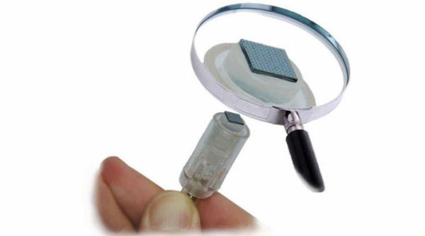 据皮肤科张庆瑞主任介绍,纳米晶片由高纯度的单晶硅制成, 在边长为5mm的正方形纳米晶片上均匀分布100个纳米针,针尖直径仅为100纳米。配合促渗仪振动导入,短时间内可以在皮肤表面打开成千上万的微细孔道,可以大大促进外用药物及护肤品的吸收。纳米晶片在达到促进药物吸收的同时,不会触及神经血管,安全无痛,且通道在20min即可自然闭合。